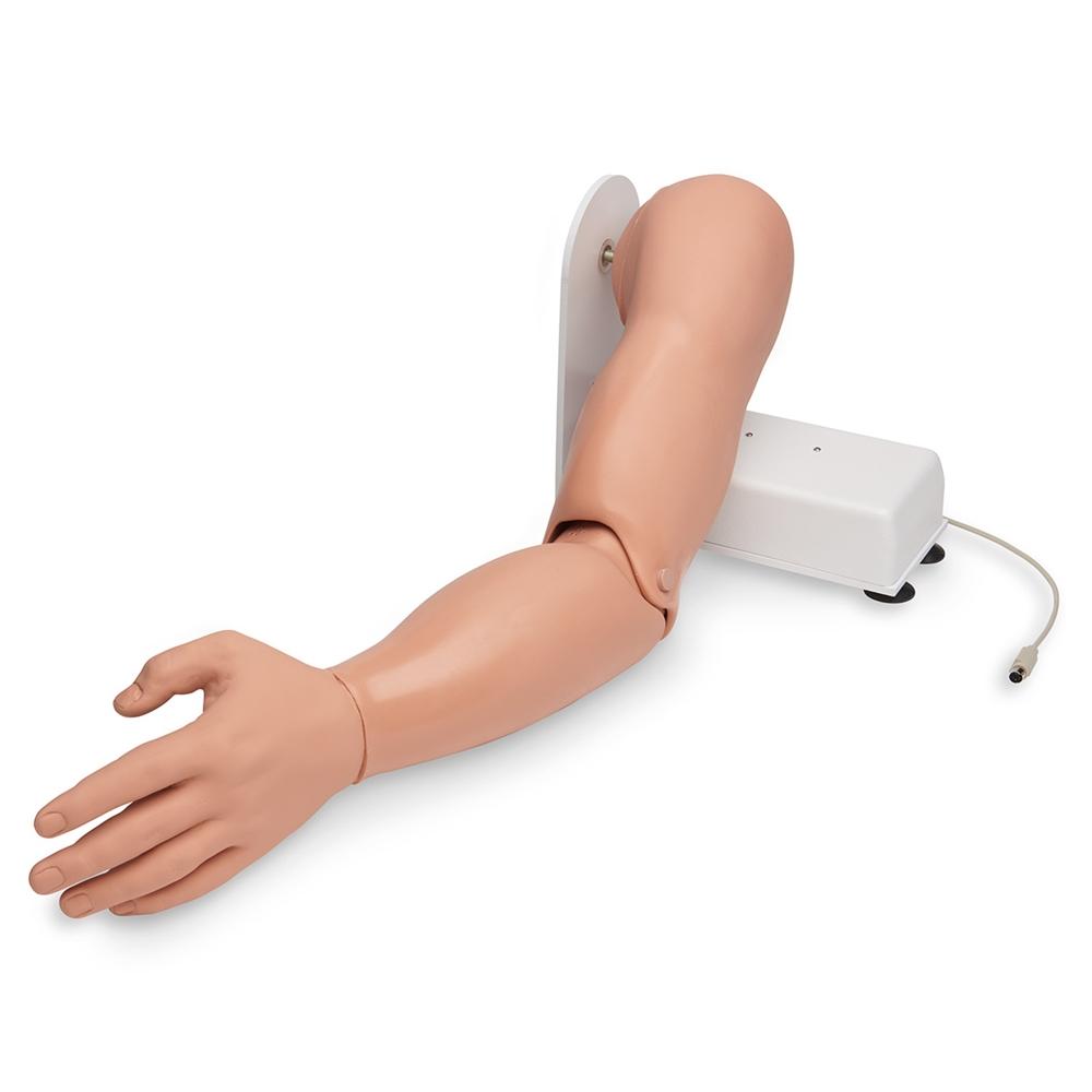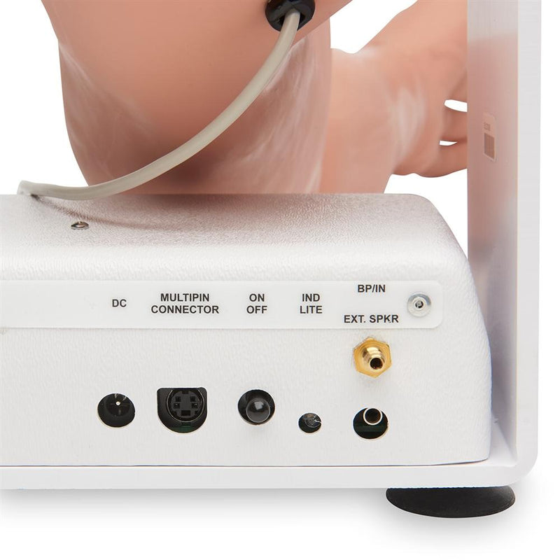 This standalone unit incorporates sphygmomanometer placement, palpation of the radial pulse, variable systolic and diastolic pressures from 0-300 mm Hg in two mm increments, variable amplitude of sound heard at the antecubital site, sound jack for group listening, auscultatory gap setting, and heart rate settings. This battery operated trainer can be plugged into 110V AC to save batteries.
