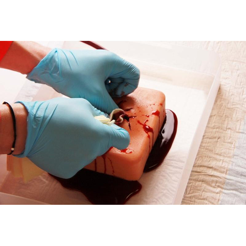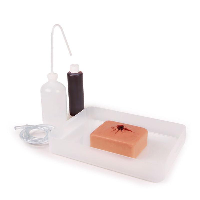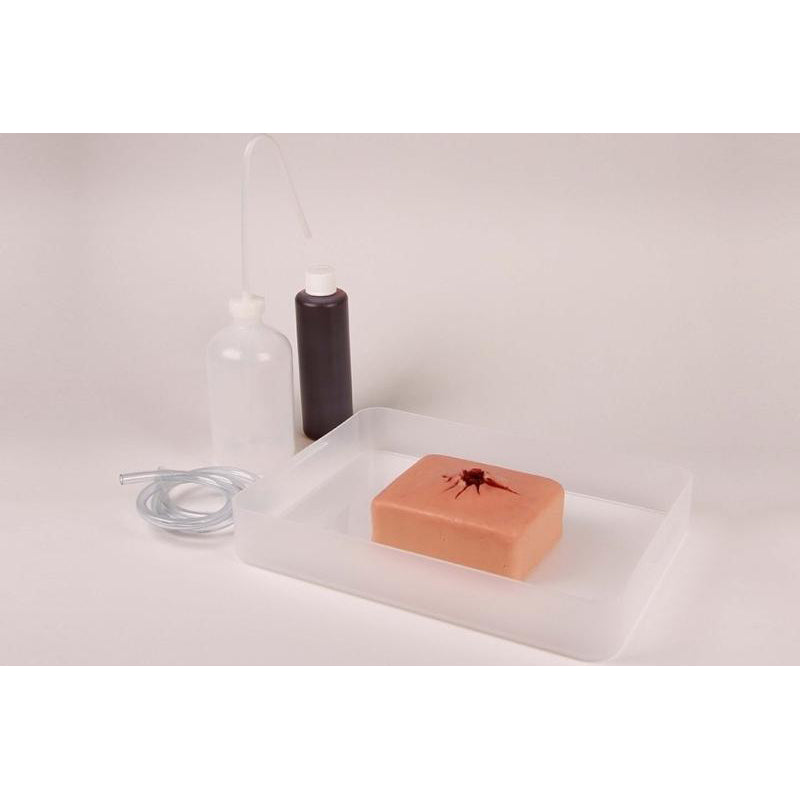 The Simulator is made of a high quality and very durable silicone that simulate human skin and tissue. Common hemostatic wound pads can be used. We recommend to use our washable, non-staining artificial blood (Ref.no. 7024) with the simulator. The trainer is fast and easy to clean after use.
