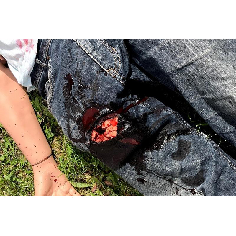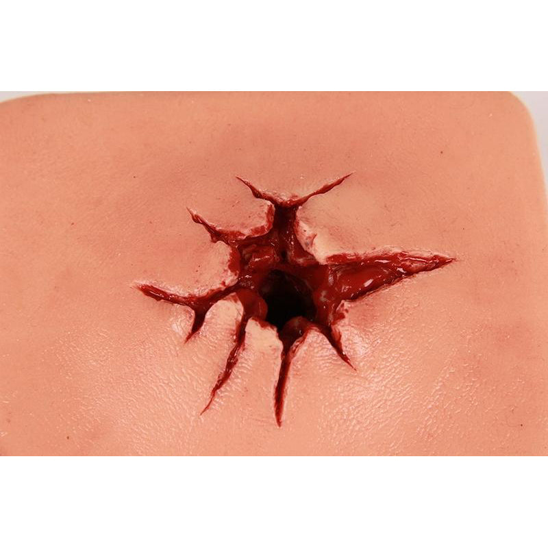 Shown is a realistic bullet wound with bleeding function caused by a large gun caliber, ideal for training the Wound Packing procedure.