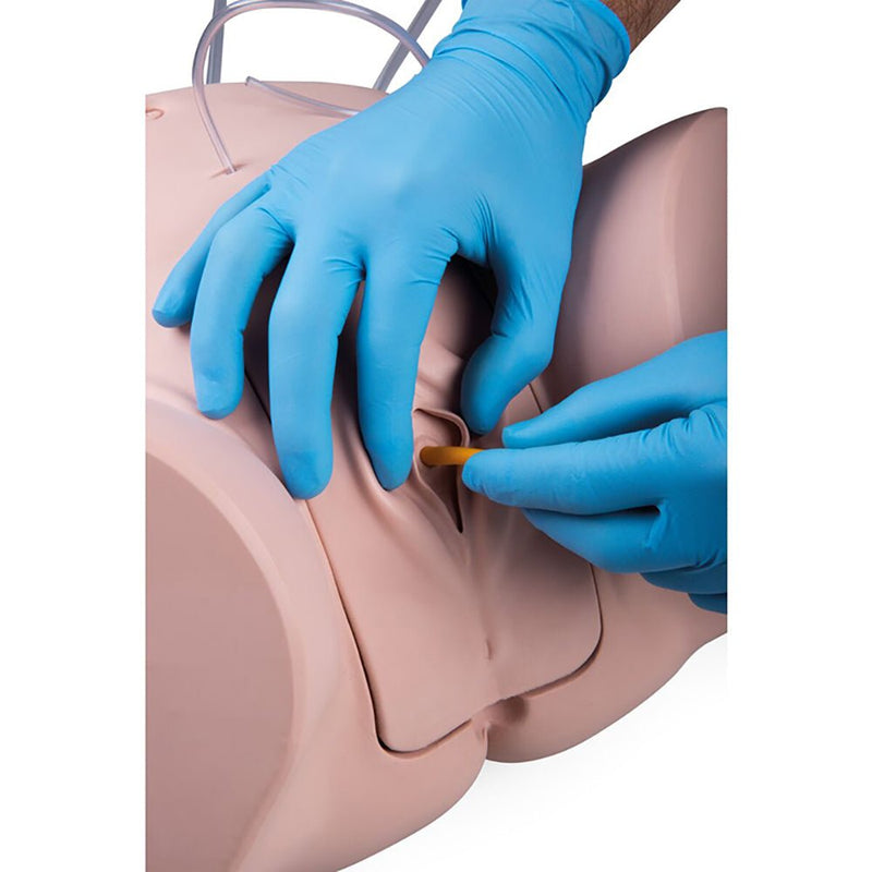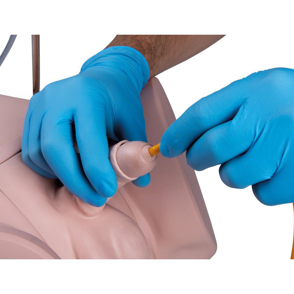 If catheterization through the urethra is no longer possible, a suprapubic catheter must be inserted. The suprapubic catheter is usually placed by the doctor through the abdominal wall into the filled urinary bladder and fixed to the abdominal wall. The PRO version can be used to practice changing the suprapubic catheter and its care. Care includes changing dressings, cleaning the catheter and disinfecting the wound.