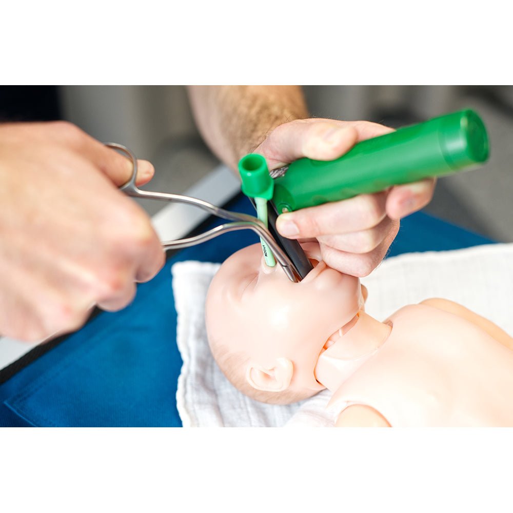 Intubation Phantom of New-Born Baby with the co-operation of Prof. Dr. Chr. Fusch, Uniklinik Greifswald, we have developed a life-size model for orotracheal and nasotracheal intubation. In addition to a moveable lower jaw, great importance has been placed on faithfully copying the nasal, oral and pharyngeal cavities.