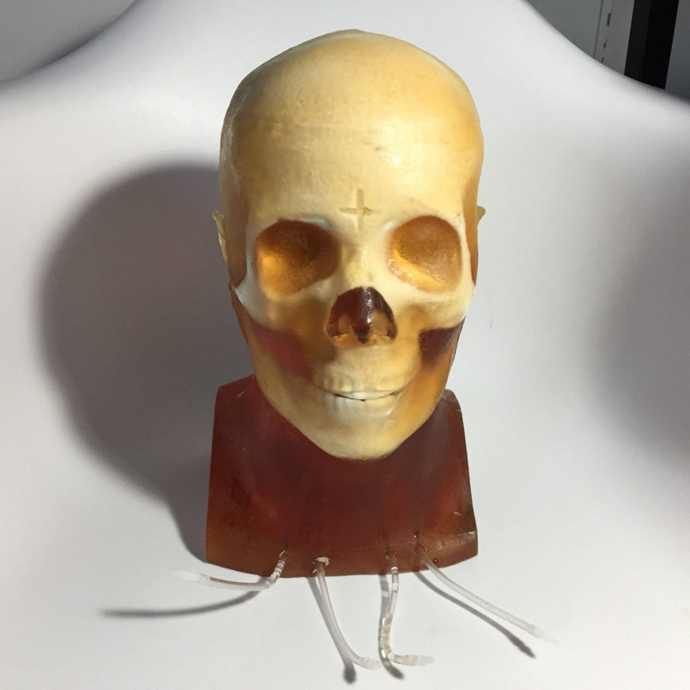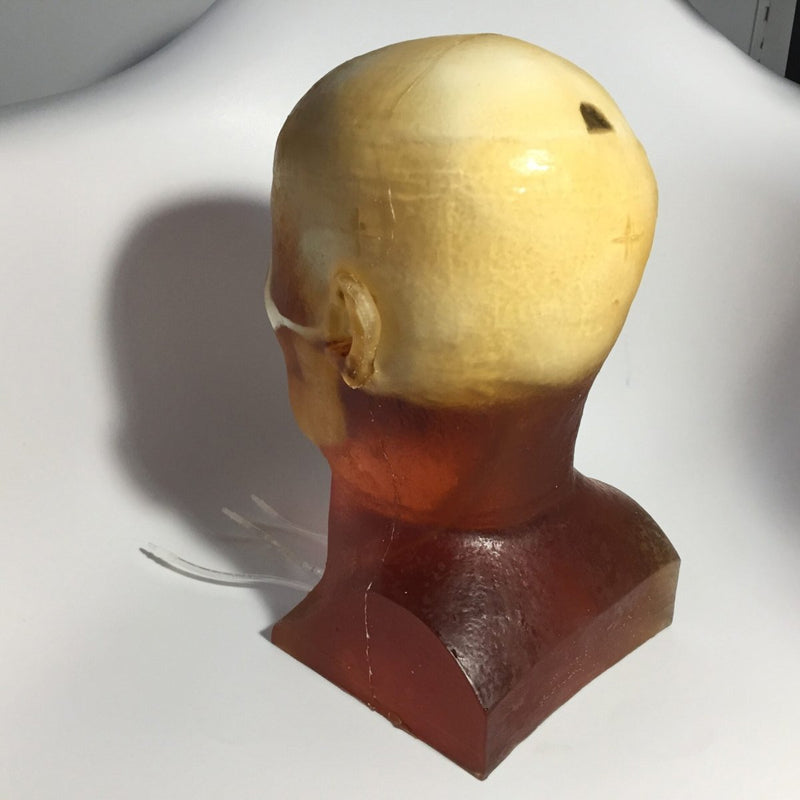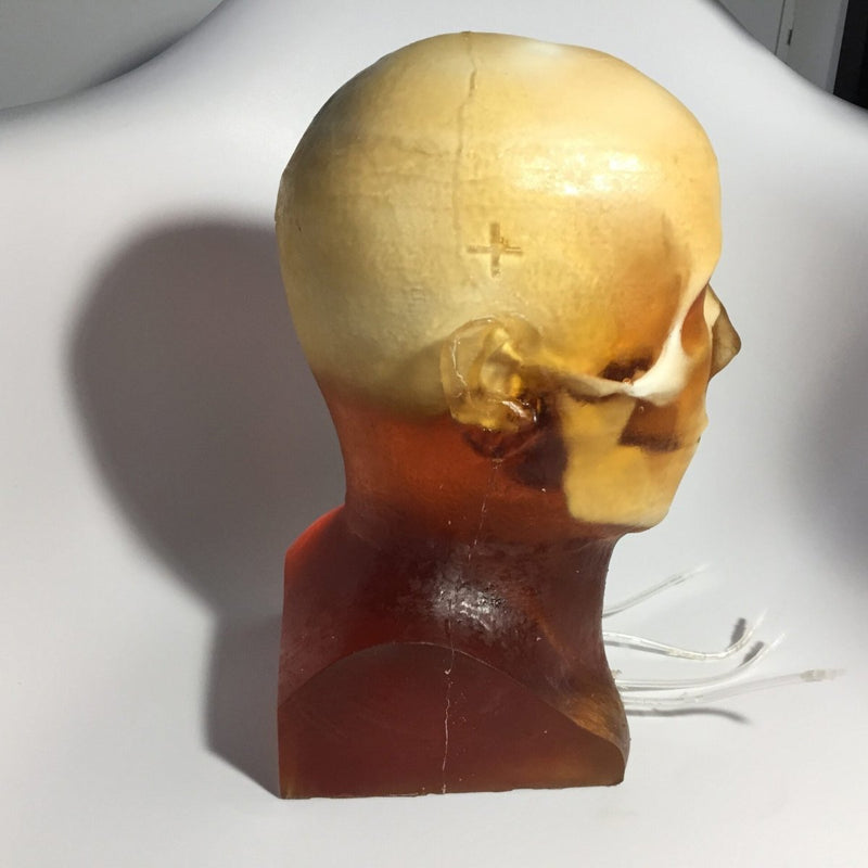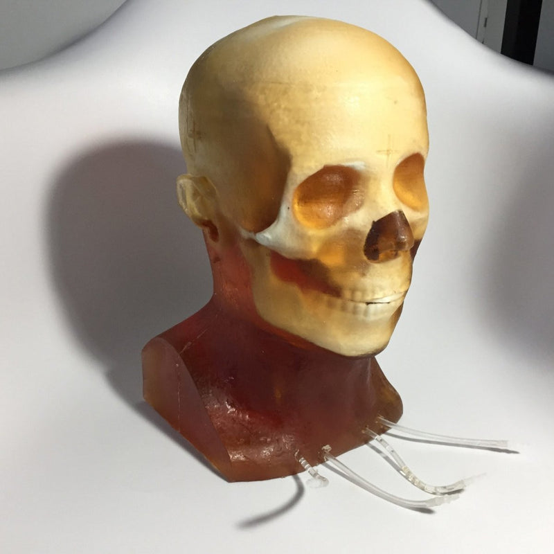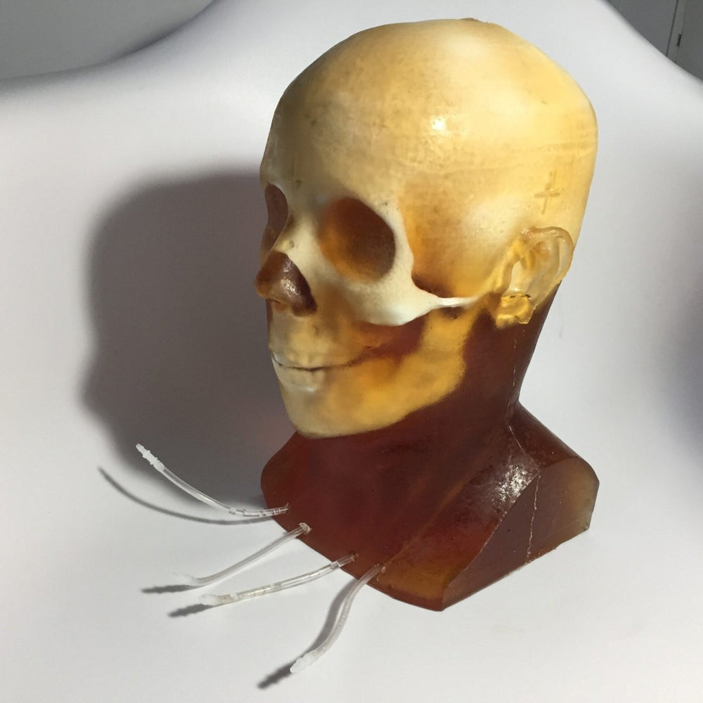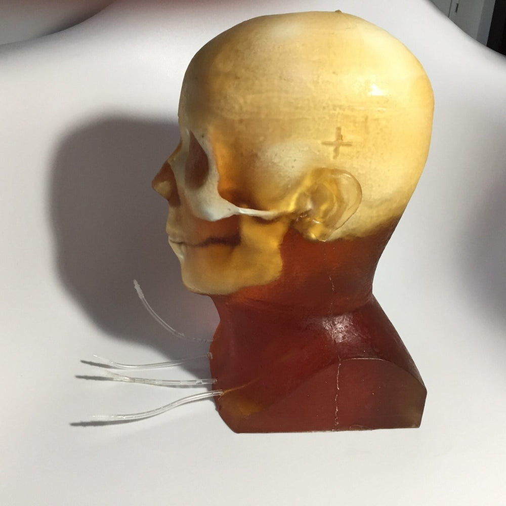 The Dynamic Adult Head phantom is visible on Ultrasound, MRI, and X-Ray/CT scans. This head phantom can also be utilized for angiography training and applications. The brain parenchyma is made of an ultra-soft polyurethane-based material that mimics soft tissue, and its anatomical shape was created based on the MRI scan of a human brain. The materials used to build this phantom are stable with time, and they do not dry out. The skull bone has a realistic three-layered structure with an inner diploe layer. This phantom can be used with Barium-sulfate, Iodine-based, Gadolinium-based, Microbubble, and Iron Oxide-based contrast mediums.