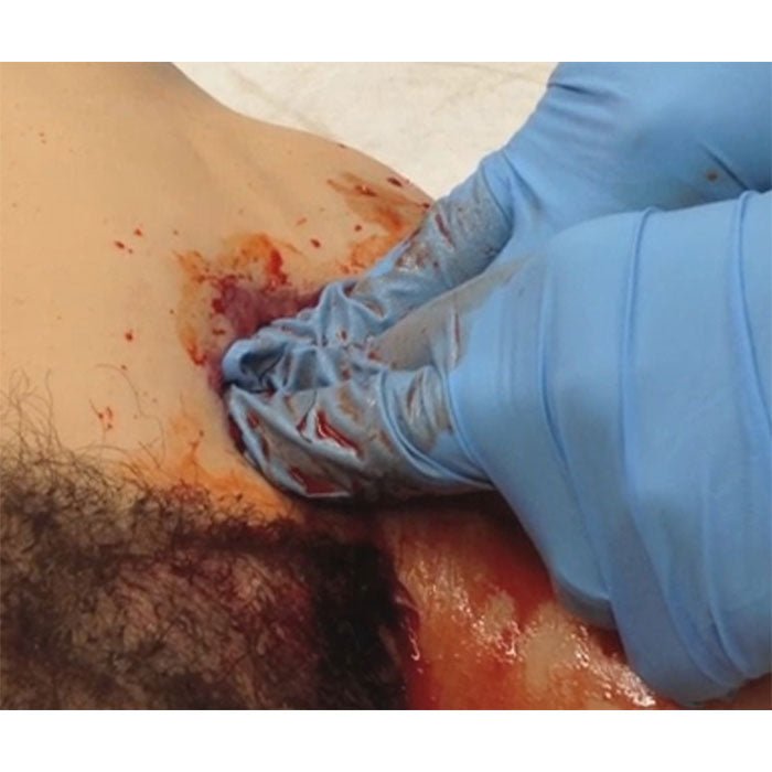 Paramedics, and other First Responders. It includes a packable hemostatic wound at the inguinal crease (replicated