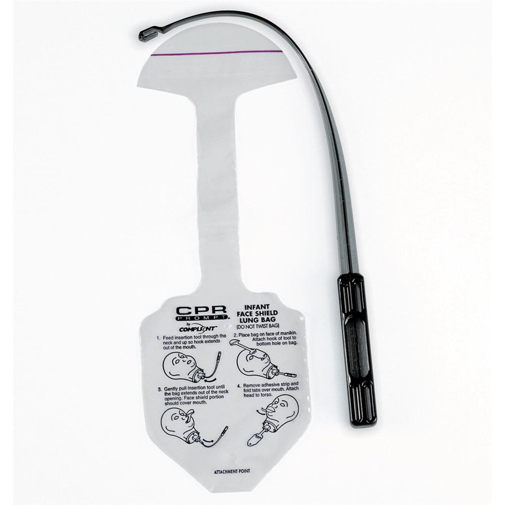 Combination face shield/lung bags for CPR Prompt manikins. Adhesive strips hold shields in place.Pkg. of 10.Insertion tool (LF06943) not included.