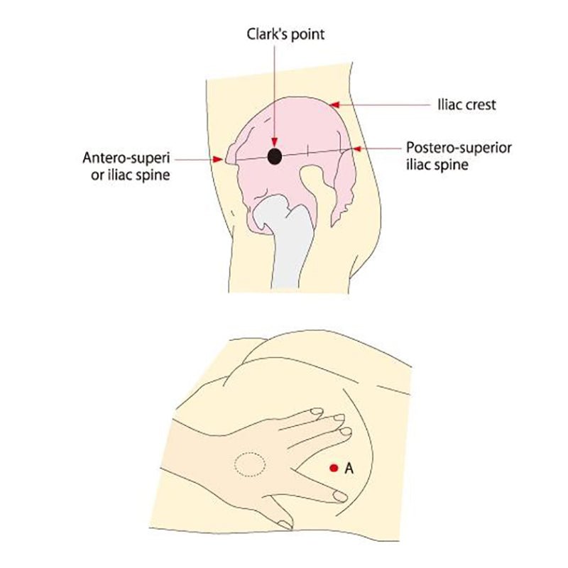 To locate von Hochstetter's injection site, place the center of the left palm on the greater trochanter and the tip of the index finger on the anterosuperior iliac spine. Spread the index and middle fingers as widely as possible. The central point between the index and middle fingers and the iliac crest isvon Hochstetter's site (Point A).