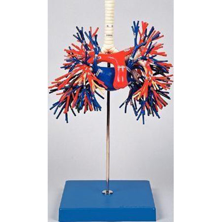 This life-size model is mounted on a base. The model shows in detail the relation between the bronchus, the pulmonary arteries, and veins. You can see clearly how the arteries and veins are distributed to the right and left lungs. This model is based on general distribution of the bronchus and blood vessels in the lungs. This will serve as a good guidance of surgical operation and taking a roentgenogram and as a teaching instrument for medical students.Brochure