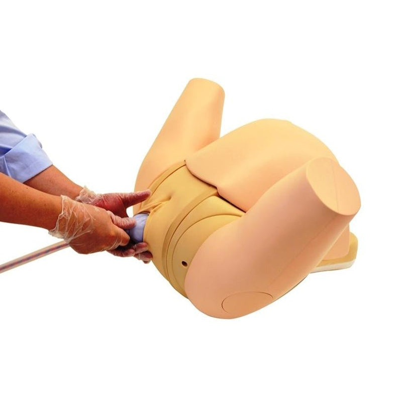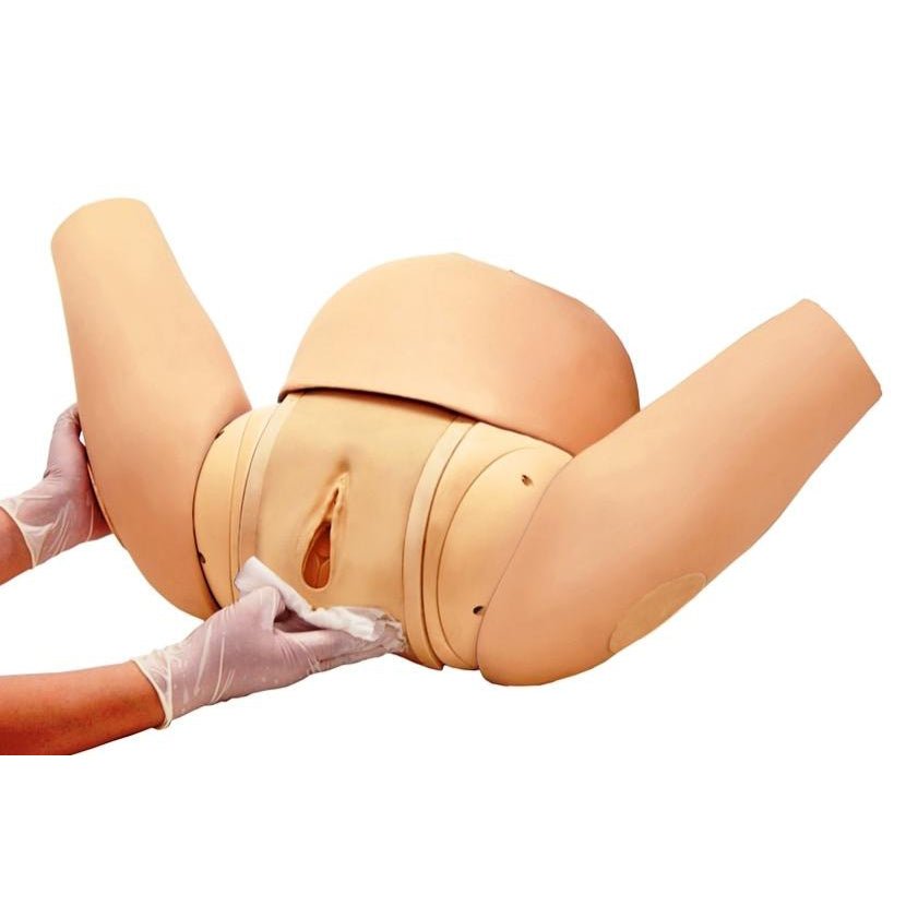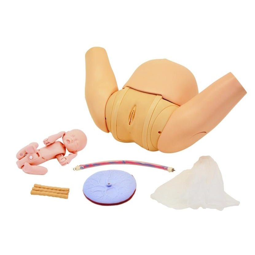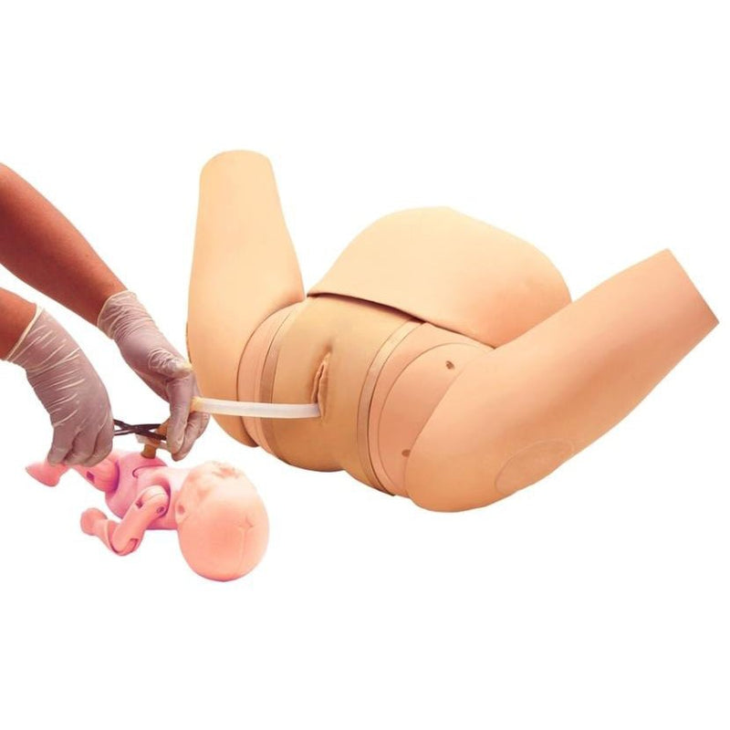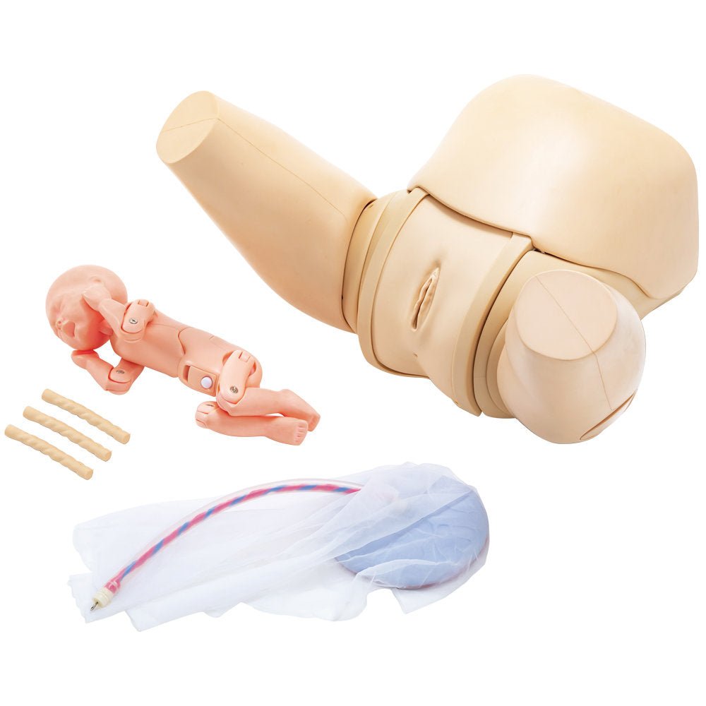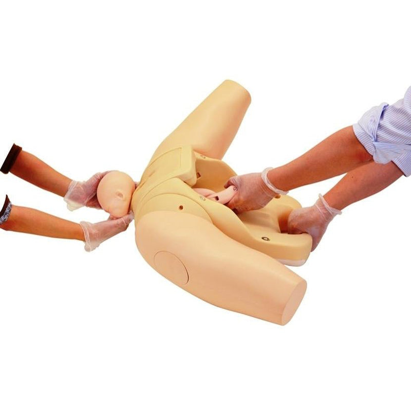 • Elastic external genitalia, realistic shape of vaginal canal and the holding handle for the maternal body facilitate simulating a smooth delivery.