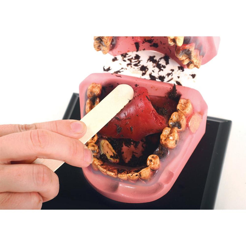 Open wide and say, “Yuck!” This customer favorite says a mouthful! Life-size replica of the teeth, tongue, and gums features lifelike detail of the disgusting oral damage done by smokeless tobacco. The handpainted, realistic, hinged model comes mounted on a wooden display base and includes a jar of tobacco to create tobacco juice. 6" x 4" x 8".Made in USA by Health-Edco and sold by GTSimulators.