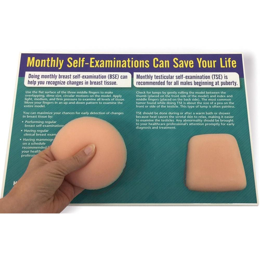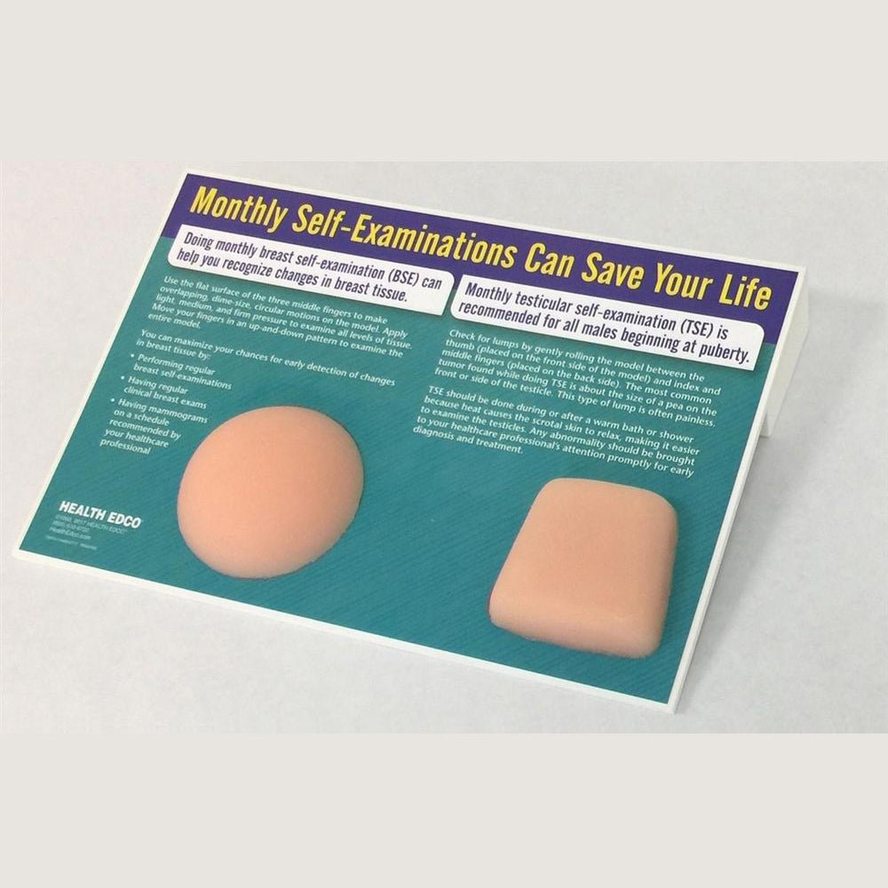 Designed to minimize embarrassment in mixed groups, this tabletop display features simulated breast and scrotal tissue molded in generic shapes that viewers can pick up and palpate. The BIOLIKE 2™ models contain lumps that can be felt using the correct techniques for breast and testicular self-examination. Information on the display background explains the importance of breast self-awareness and testicular self-exam, as well as providing instructions for breast and testicular self-examination. 13½" x 9" x 2".