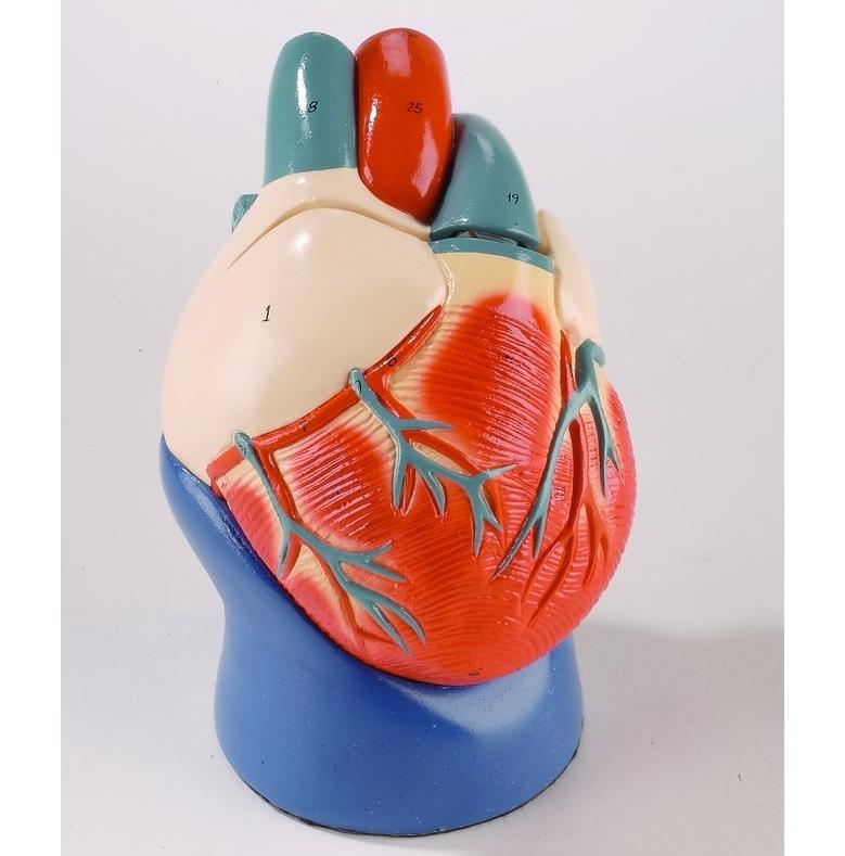 This resilient vinyl heart divides into anterior and posterior sections to access its pumping chambers and valves. Vessels are color-coded red or blue to indicate whether they carry oxygenated or deoxygenated blood. Significant cardiac features, 33 in all, are hand numbered on the model for identification in the accompanying key.Nesting on a form-fitting display base, the heart lifts off for hands-on observation and study.