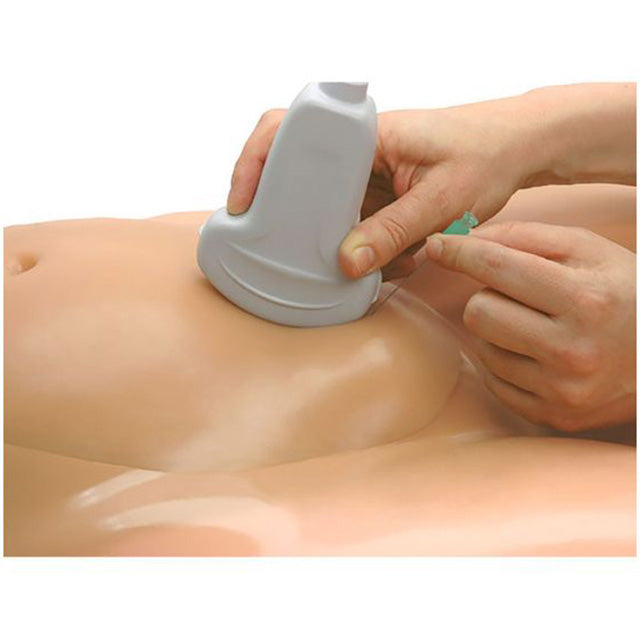 Our percutaneous umbilical cord blood sampling (PUBS) – and Fetal Umbilical Blood Sampling (FUBS) ultrasound training model consists of an base platform of a gravid 35 year old patient and contains a uterus with antero-lateral placenta, slightly yellow amniotic fluid, 18 week male fetus with anatomically correct external architecture, and 3-vessel umbilical cord containing red simulated blood fluid. Users receive immediate feedback as to accurate access of the umbilical cord via contrasting simulated blood fluid when the umbilical cord is accurately accessed. Users can simulate arterial pulsation in the umbilical cord by connecting a syringe to the quick fill luer lock and toggling the syringe plunger, adding an additional level of realism to the ultrasound training experience. Fluid removed during ultrasound guided fetal umbilical blood sampling training is easy to refill using a quick fill port.
