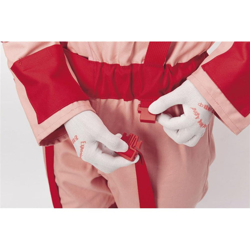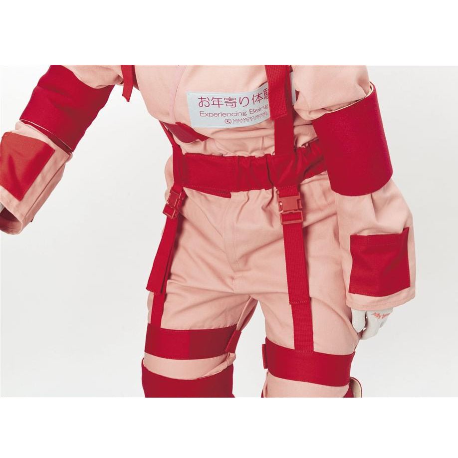 This device allows students to personally experience age-related physical changes. This suit-type simulation gear, which can be put on and taken off easily, is suited for the use in a group session to experience being old. It takes about 3 minutes to put on the suit. This body suit-type gear worn like overalls allows students to experience restrictions in physical functions with little loss of time. The hip angle and motion ranges of various parts of the body can be adjusted with belts. Age-associated changes and paralysis of one side of the body can be experienced. Note: Please be aware that this suit might be small for training in tall and big people.