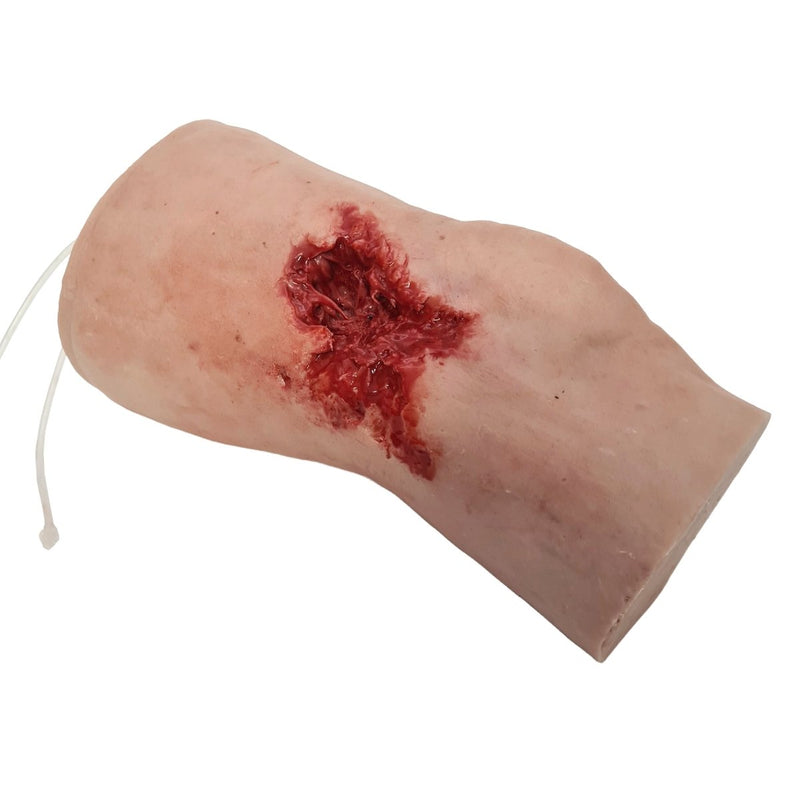 Scenario: This knee trauma trainer simulates gunshot wounds caused by a high-caliber projectile. The entry wound is on the inner thigh, with a large exit wound on the upper posterior thigh.