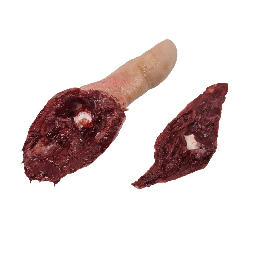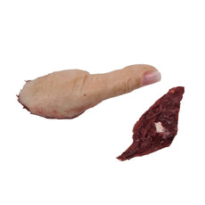 Severed male thumb for amputee trauma scenario. Visual effect from one side only.Our trauma sleeves look and feel realistic. They are made with soft, skin-like silicone with embedded mesh for added strength. The back has velcro and separate backing fabric. The backing fabric makes it easy to adjust the sizing and application. Many of our sleeves can be used in various places on the body [SP] or manikin.