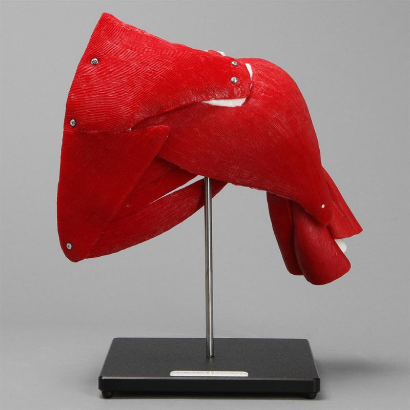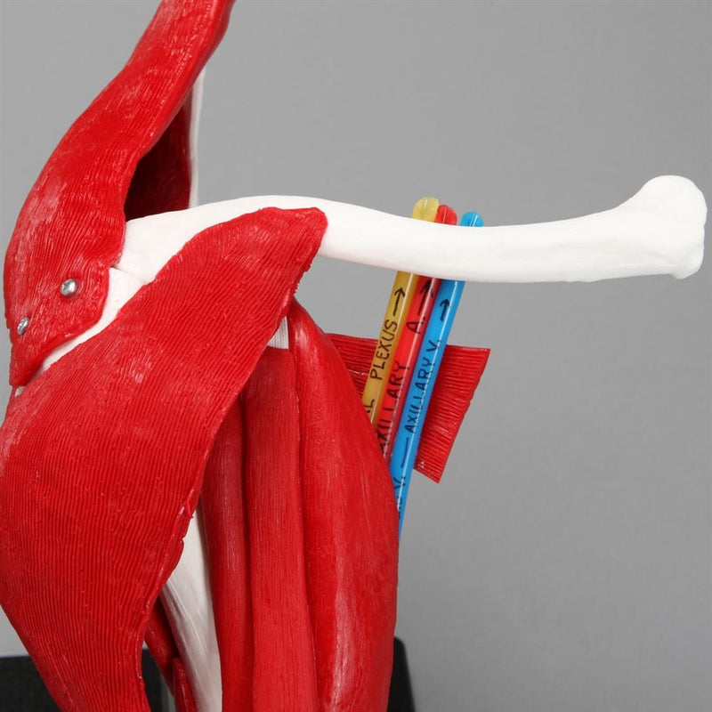 Includes all of the major muscles and larger vessels from shoulder to midshaft humerus. Mounted on removable stand. Storage duffel included. Orientation: Right.