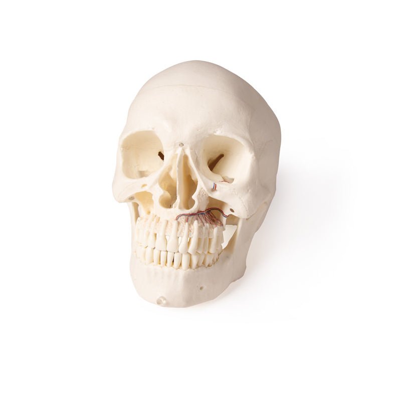 The front half of the upper and lower jaw can be removed to reveal teeth with roots, unilateral nerves and blood vessels as well as the maxillary sinuses. The skull is not only suitable as a perfect aid for learning anatomy, but also as an explanatory aid for oral surgery and implantology.