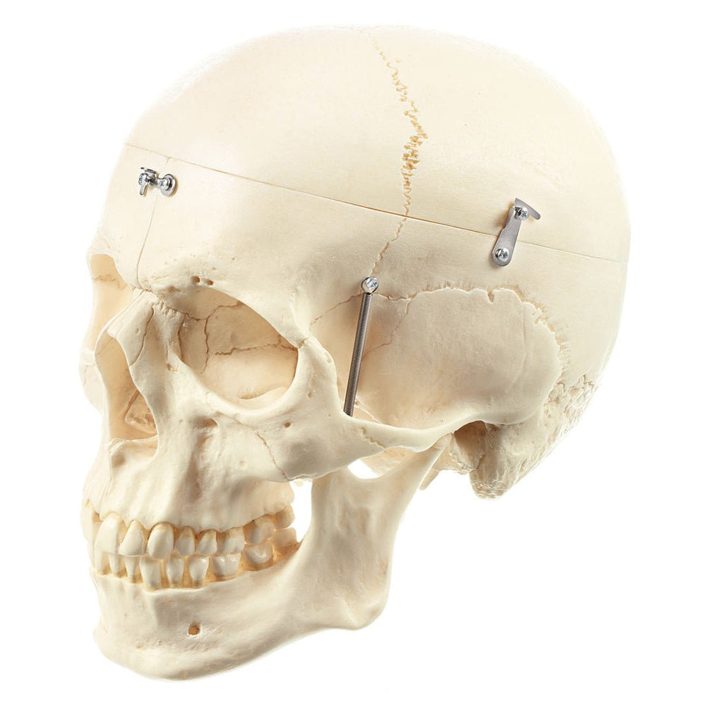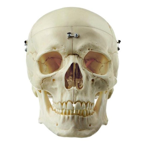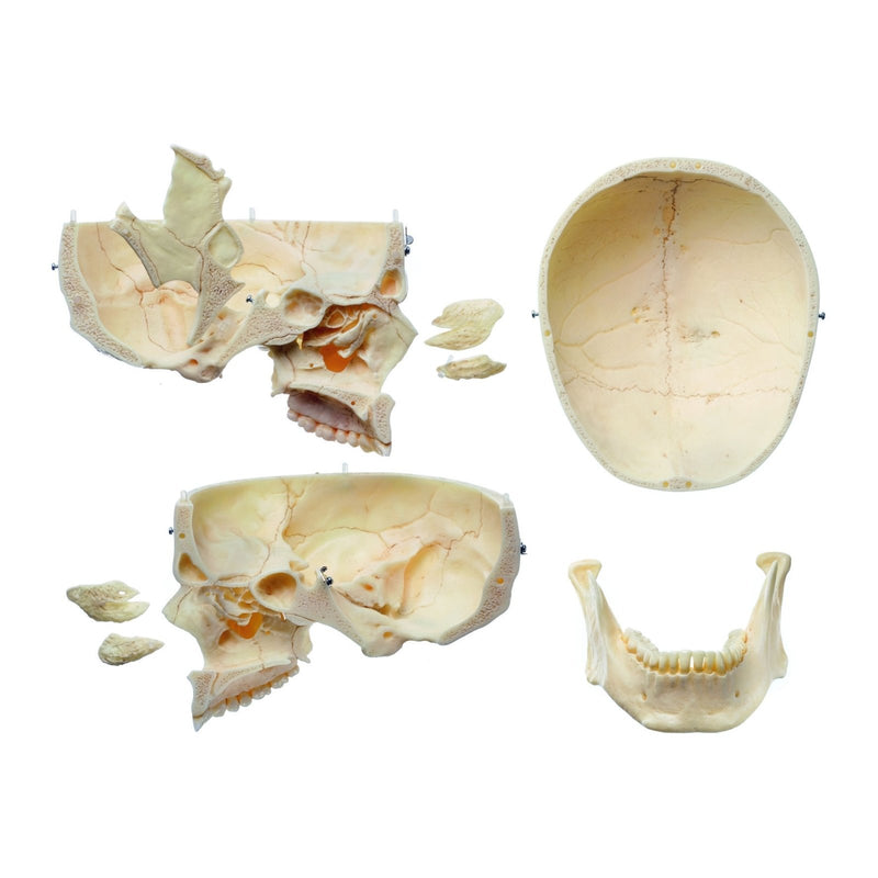Modeled according to nature, made in SOMSO-Plast®. After removing the cranium, the base of the skull, sectioned through median line into two halves where the nasal septum, the paranasal sinuses and turbinate bones (2) are shown. The lower jaw is movable. Model separates into 9 parts. Length: 17.5 cm, width: 14.1 cm, size: 51.2 cm, weight: 800 gCleaning and disinfecting your SOMSO Model:Spray a rapid and effective water based disinfectant for use on surfaces and wipe with a soft cloth.