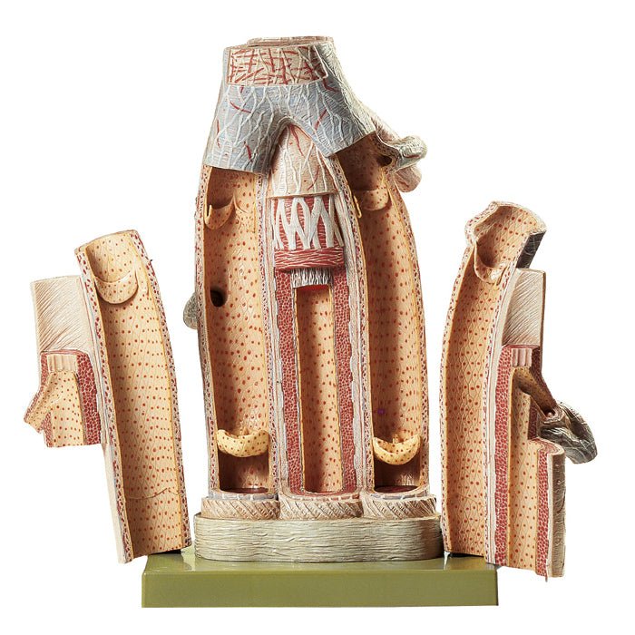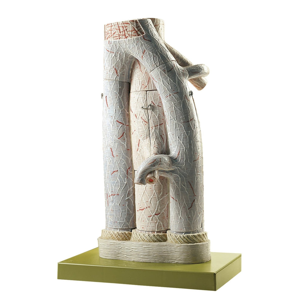 Enlarged many times, made in SOMSO-Plast®. This model has been made after a vascular preparation of the lower leg. Representation of the individual vascular layers, the valves of the vein are shown closed and open. Model separates into 3 parts. On a green base. Height: 63 cm., width: 39 cm., depth: 31 cm., weight: 6 kgCleaning and disinfecting your SOMSO Model:Spray a rapid and effective water based disinfectant for use on surfaces and wipe with a soft cloth.