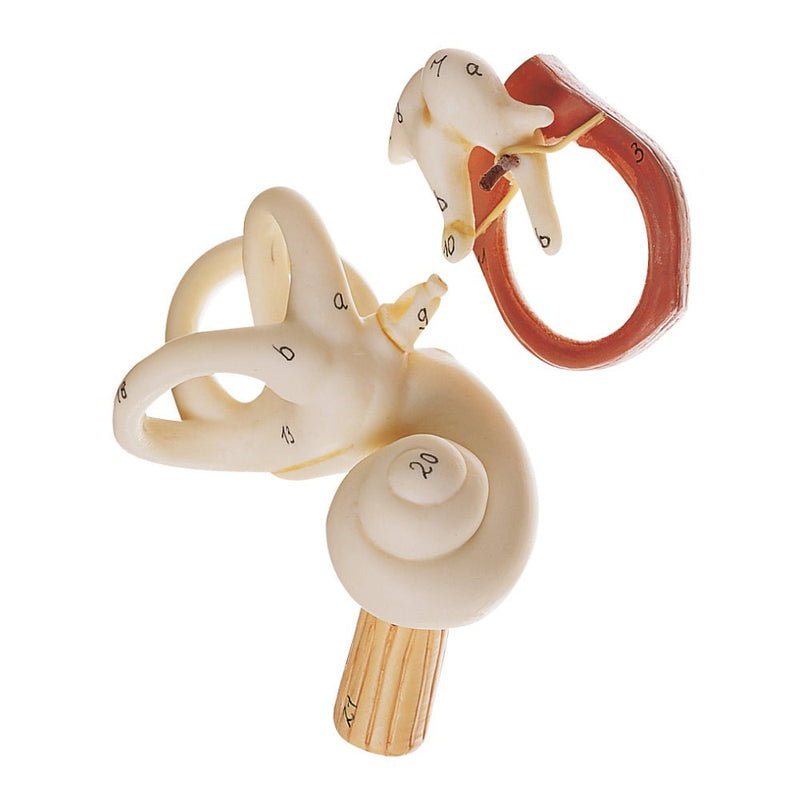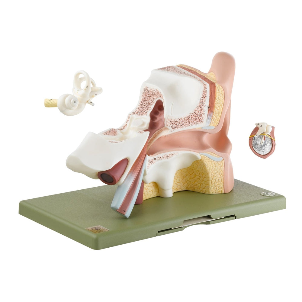 Enlarged approximately 3 times, in SOMSO-PLAST®.Tympanic membrane with malleus and incus as well as removable labyrinth with stapes.