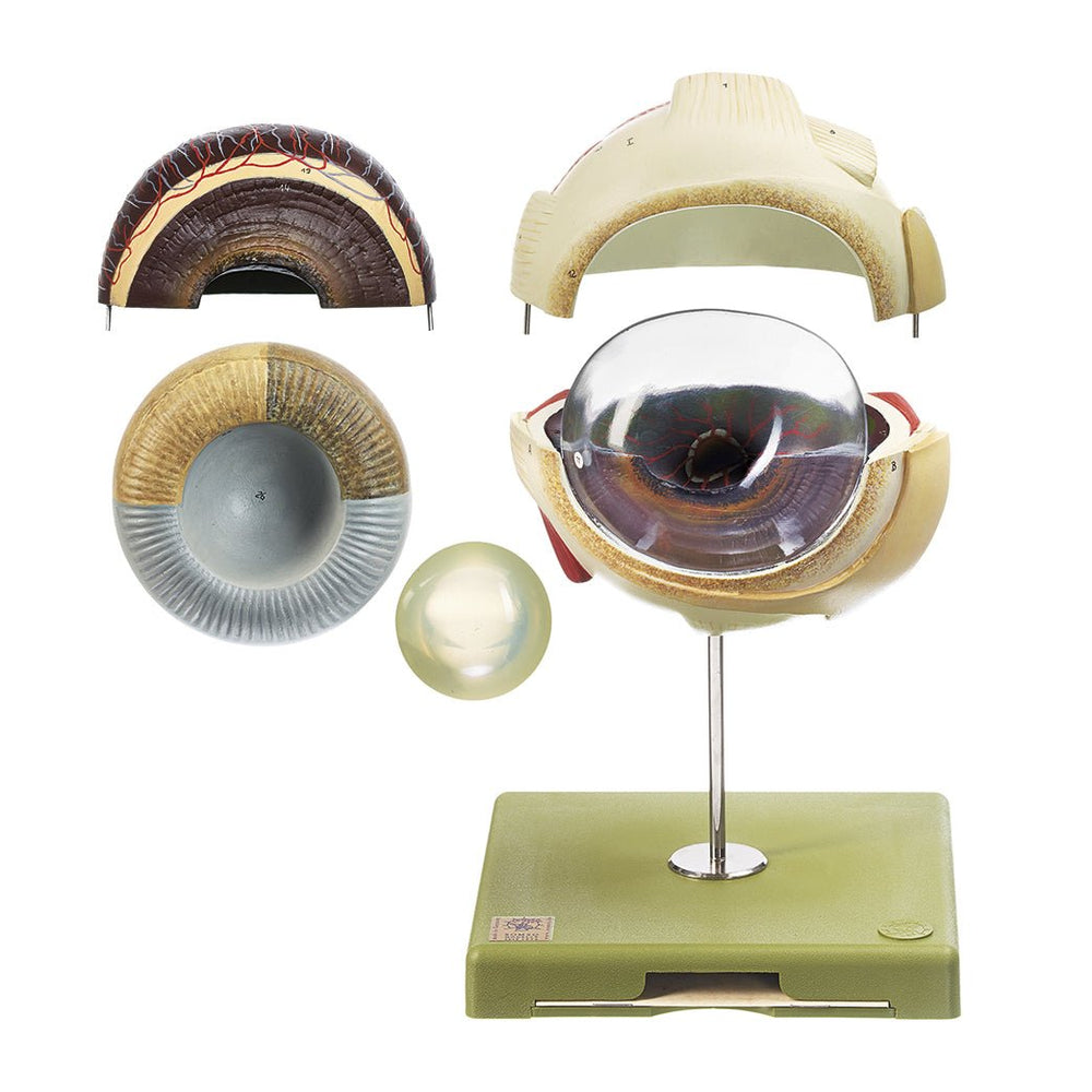Enlarged 5 times linearly, cut horizontally, corium, vitreous humour and lens removable. Model separates into 5 parts. Mounted on stand and base.Dimensions and Weight: