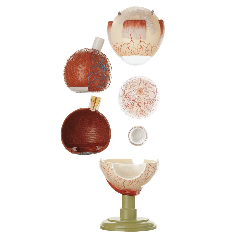 Enlarged approx. 5 times, made in SOMSO-Plast®. Sectioned horizontally and separates into 6 parts: upper half of the sclerotic membrane, choroid membrane (2), Retina with vitreous humour, lens, lower half of the sclerotic membrane with stand. Height: 20 cm., width: 14 cm., depth: 14 cm., weight: 600 gCleaning and disinfecting your SOMSO Model:Spray a rapid and effective water based disinfectant for use on surfaces and wipe with a soft cloth.