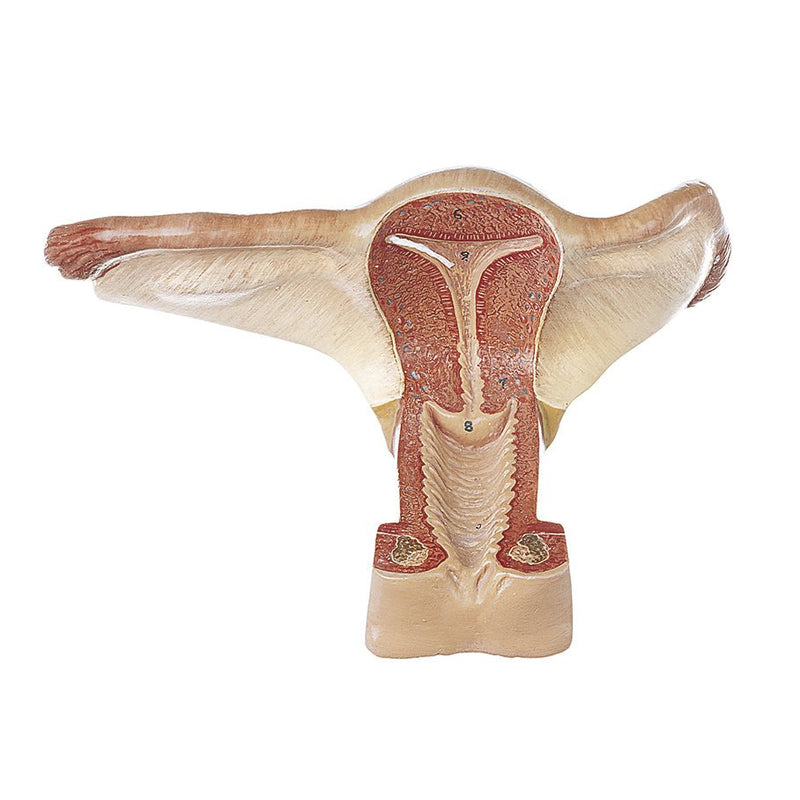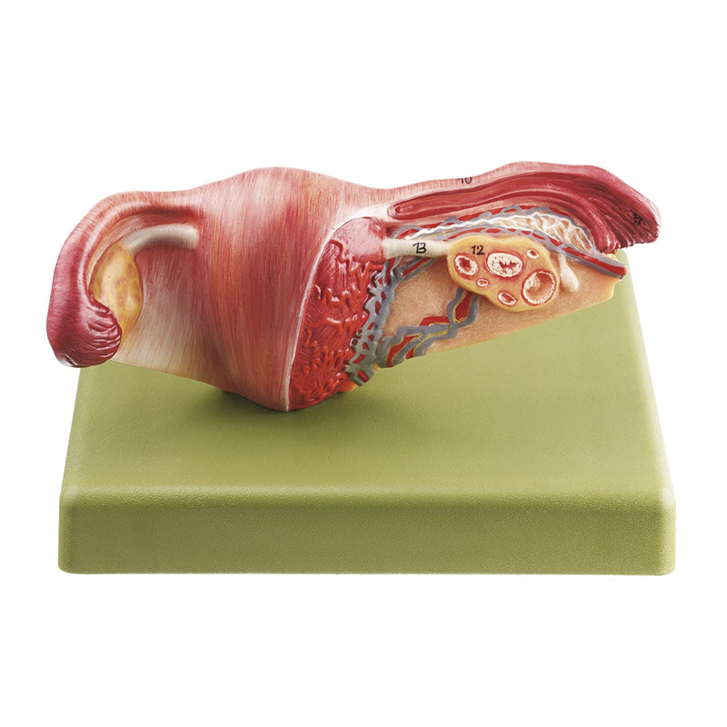Natural size, ventral and dorsal view of the internal genital organs, partly shown in section. Female Genital Organs Model in one piece and delivered on a green base.Female Genital Organs Model Dimensions and Weight: