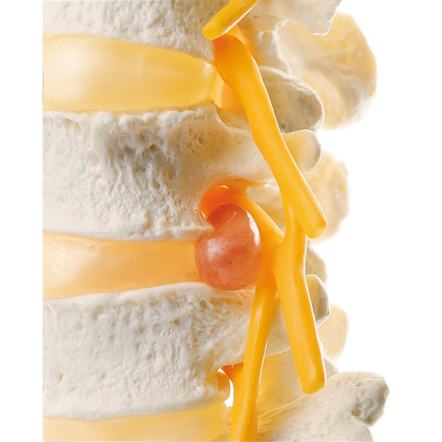 Cast from natural specimen, made in SOMSO-Plast®. With spinal cord and nerve endings. Shows hernia of dorsolateral intervertebral disc (prolapse of the pulpous nucleus). On a stand and green base.