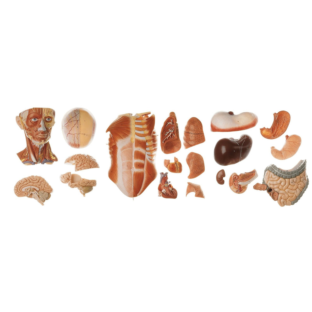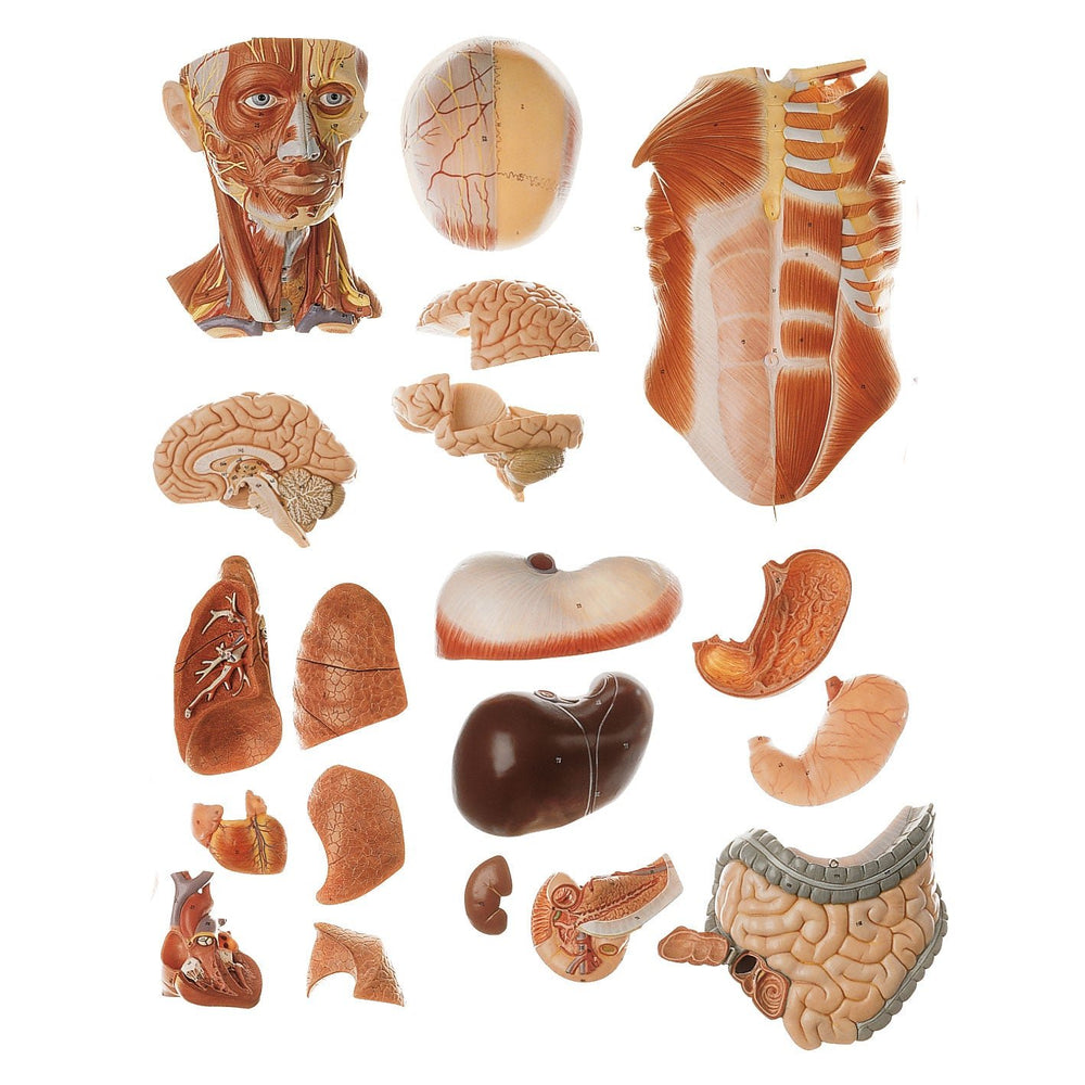 about 3/4 natural size, made in SOMSO-Plast®. Model separates altogether into 36 parts as follows: body, head, vault of cranium, brain (3), thoracic and abdominal wall, right lung (2), left lung (2), heart (2), diaphragm, liver, stomach (2), small and large intestine, duodenum with pancreas, ilio-cecal valve, right half of kidney, right arm, left arm (6), muscles of the left leg (8). On a stand and green base with rollers.