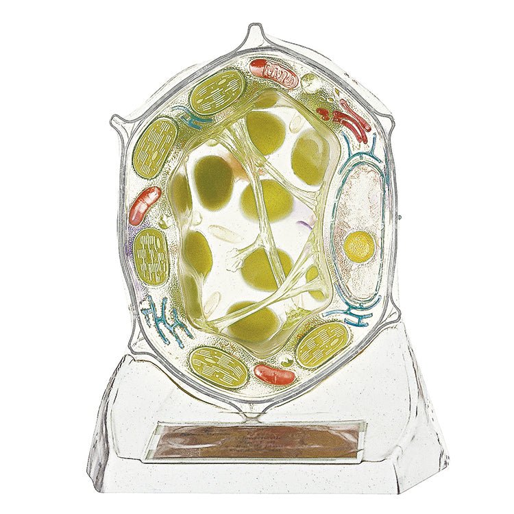 After Prof. Dr. W. Weber. Enlarged approximately 6000 times, made in transparent special plastic material. The model provides a slightly schematic picture of a mature cell from the assimilation tissue of a plant. It combines both light and electron microscopic aspects and shows the cell components for the most part with their electron optical fine structure. Apart from the layering of the cell wall it shows the configuration of the cytoplasm and the essential cell organs, such as the nucleus, chloroplasts, mitochondria, endoplasmatic reticulum, dictyosomes and ribosomes. The use of transparent material gives an insight into the structures behind the section thus eliminating the need for dismantling the model. The stand is made up of the neighbouring cells at the bottom. On a base with explanatory key. Model in one piece.Cleaning and disinfecting your SOMSO Model:Spray a rapid and effective water based disinfectant for use on surfaces and wipe with a soft cloth.