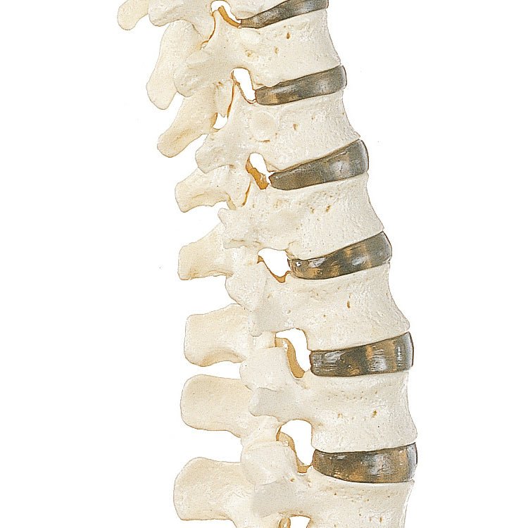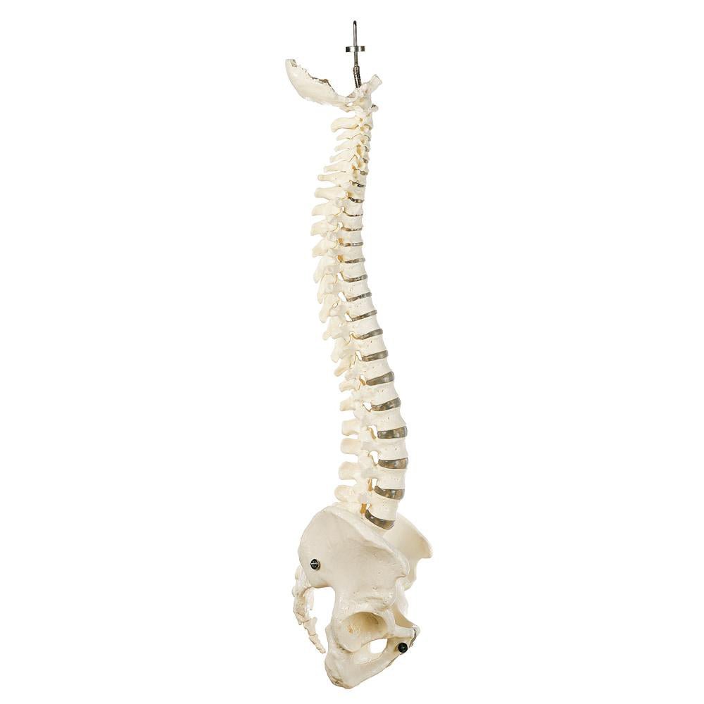 Cast from natural specimen, made in SOMSO-Plast®. As QS20 but Flexibly mounted.- Consisting of occipital bone, cervical, thoracic, and lumbar vertebrae, sacrum and coccyx as well as iliac wings