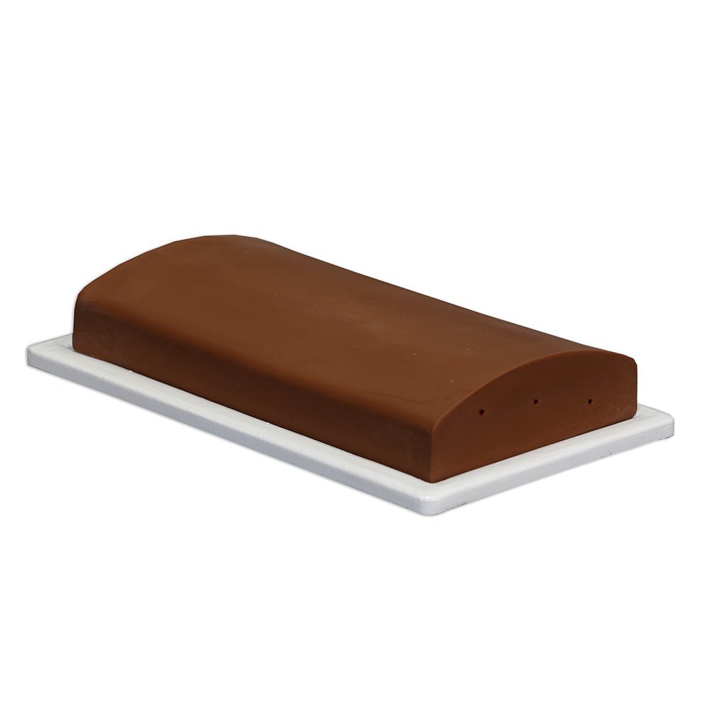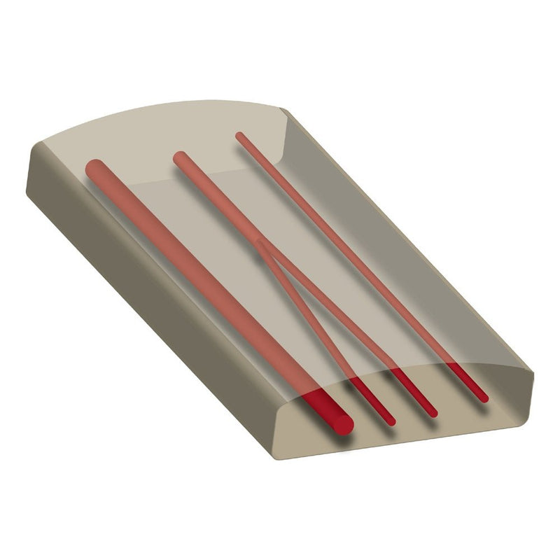 The curved contour on the top of the phantom is similar to contours on patients and has the added benefit of showing the importance of transducer positioning, as positioning can affect the quality of the image viewed–this is not possible on phantoms that are flat. This phantom can be imaged and accessed from the top, side or bottom surface, on the base or removed from the case.