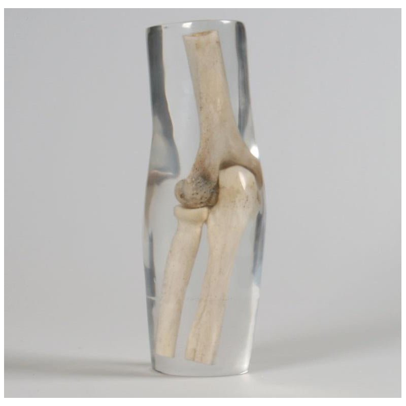 This X-Ray part phantom gives the unique opportunity to take x-ray images of single body parts again and again. The Phantom includes real human bones and allows taking real x-ray images. The model is perfect for schools and education, but also for medical technicians since the same bones can be x-rayed again and again in different settings without the danger of harming a patient. The bones are embedded in transparent plastic. This phantom is handmade and unique. It may differ in size and shape. Due to production technology there may be discoloring and cracks inside the phantom. This is related to production and is no lack of quality. This phantom is only sold against a proof of medical use.Part of upper and lower arm.