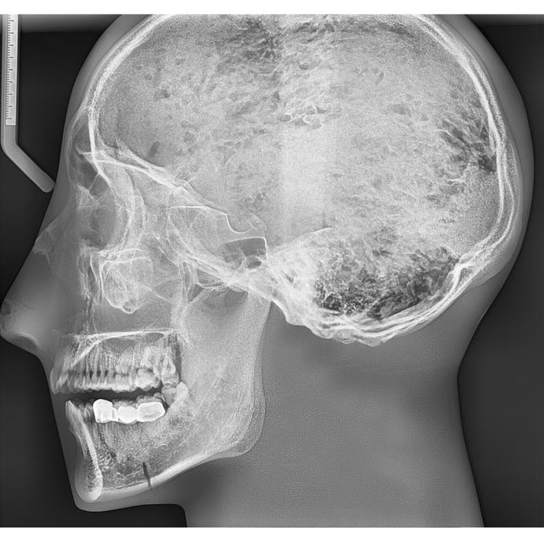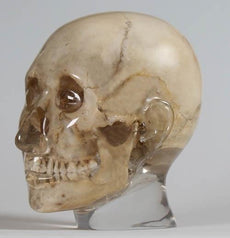 Human skull, safely embedded in plastic for easy use. The jaws are slightly open to allow dental panoramic images of the teeth. An embedded tread allows the use with a tripod.Optional Accessory